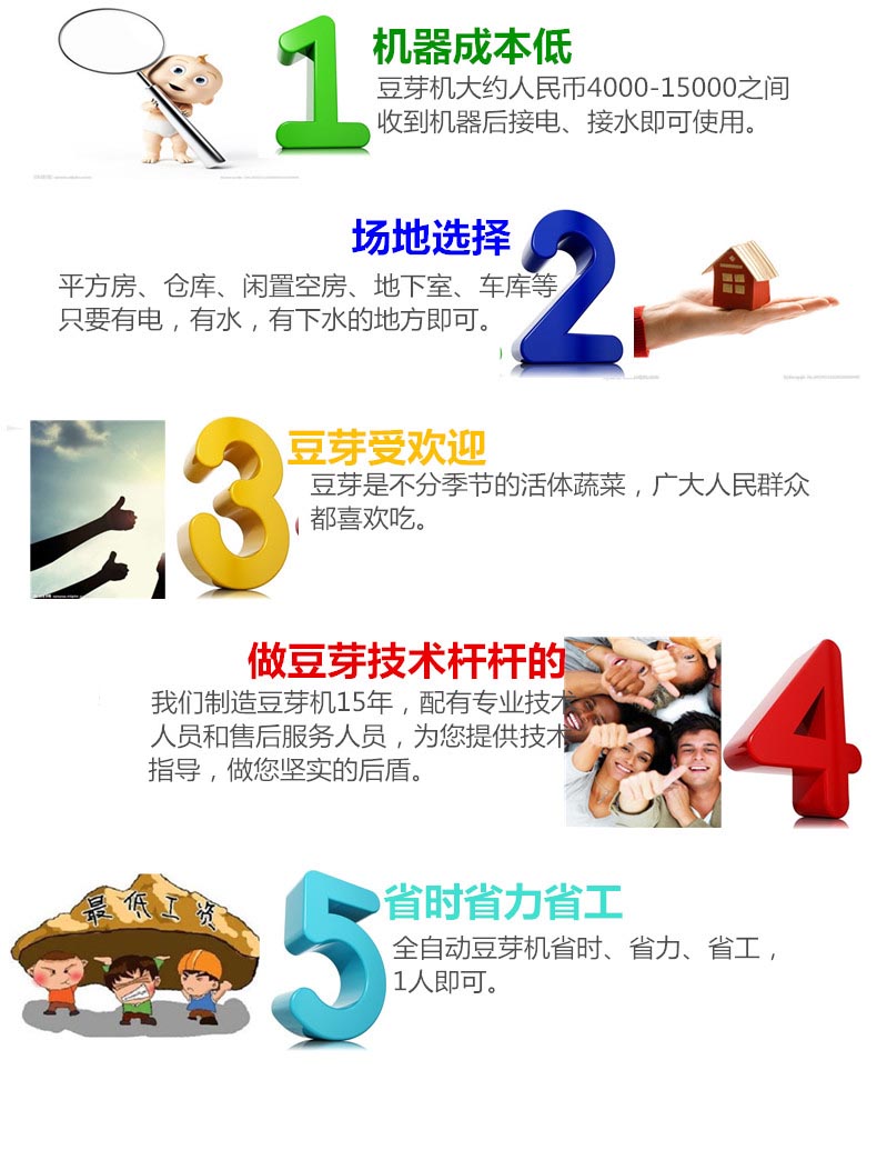 4、豆芽機(jī)制造流程: 5、豆芽機(jī)產(chǎn)品特點(diǎn): 5)減少爛芽現(xiàn)象。豆芽生長的爛芽現(xiàn)象多發(fā)生在培育后的三天左右,由于手工生產(chǎn)豆芽的周期長,易出現(xiàn)爛芽現(xiàn)象,然而采用豆芽機(jī)生產(chǎn),三天左右豆芽已經(jīng)成熟,可以采收食用,不會有爛芽現(xiàn)象發(fā)生。